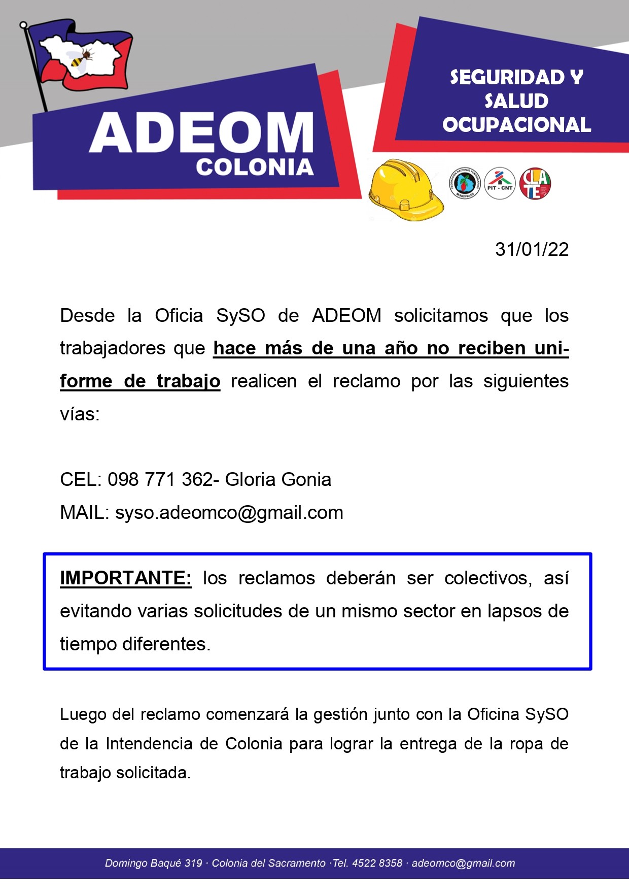 Desde la Oficia SySO de ADEOM solicitamos que los trabajadores que hace más de un año no reciben uniforme de trabajo realicen el reclamo