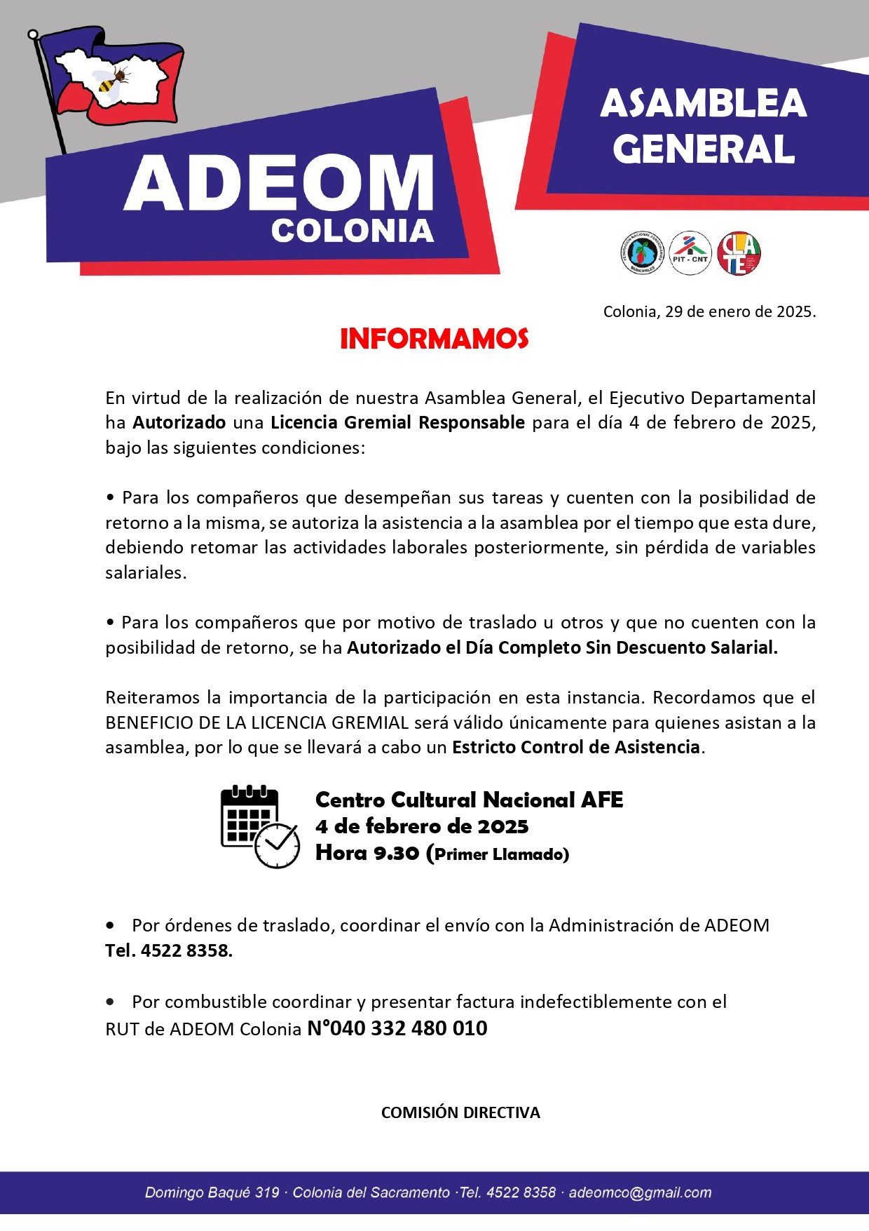 Comunicado sobre la Licencia Gremial Responsable autorizada por el Ejecutivo Departamental para el día 4 de febrero de 2025, en el marco de nuestra Asamblea General.